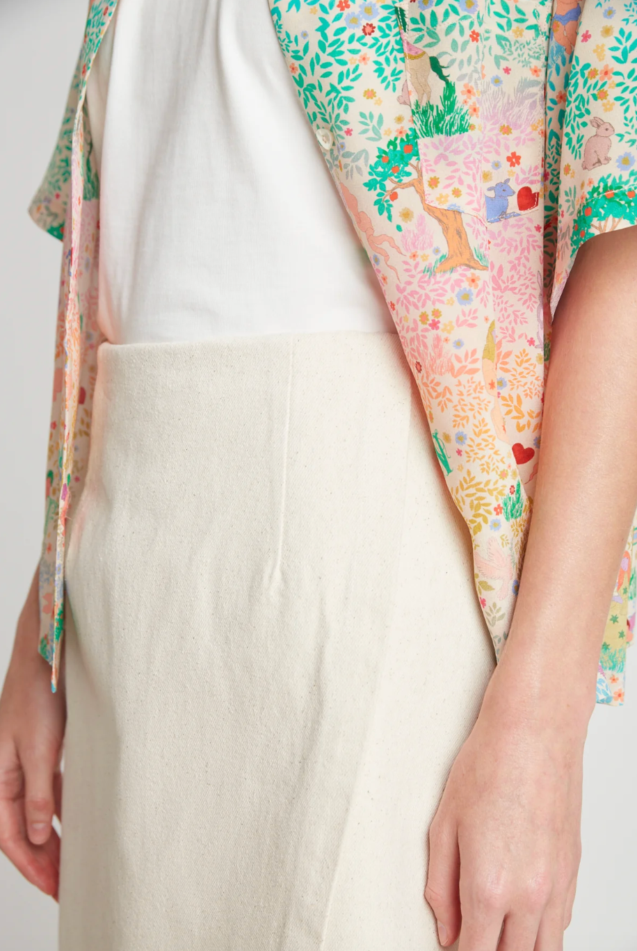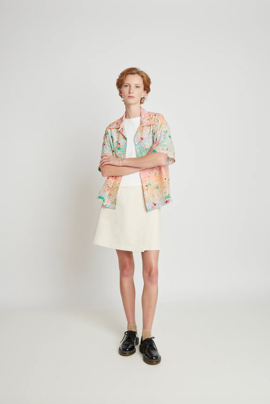 This little mini is all in good jest: with a high waist, false front wrap and centre-back zip closure, and made in Te Whanganui-a-Tara from 100% cotton, pre-consumer waste regenerated denim deadstock.