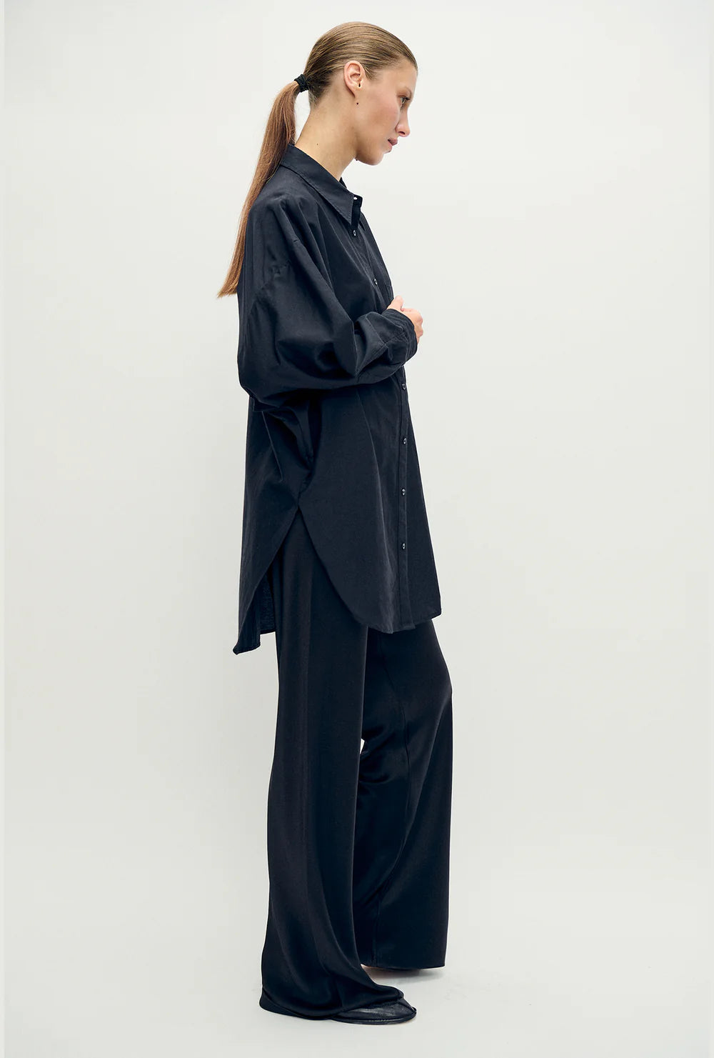 Silk Laundry lightweight shirt crafted in a silk cotton blend featuring a batwing sleeve and curved hemline. Designed for oversized wear.