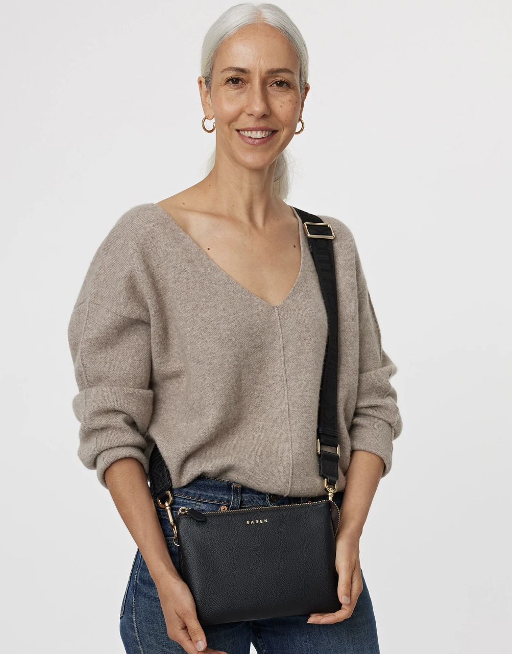 Transform any bag with your choice of a feature strap. Personalise your Saben the way you like it by adding colour or keeping it all black. If you tend to carry everything but the kitchen sink in your bag, our feature strap will ease the load and make wearing your bag even more comfortable.