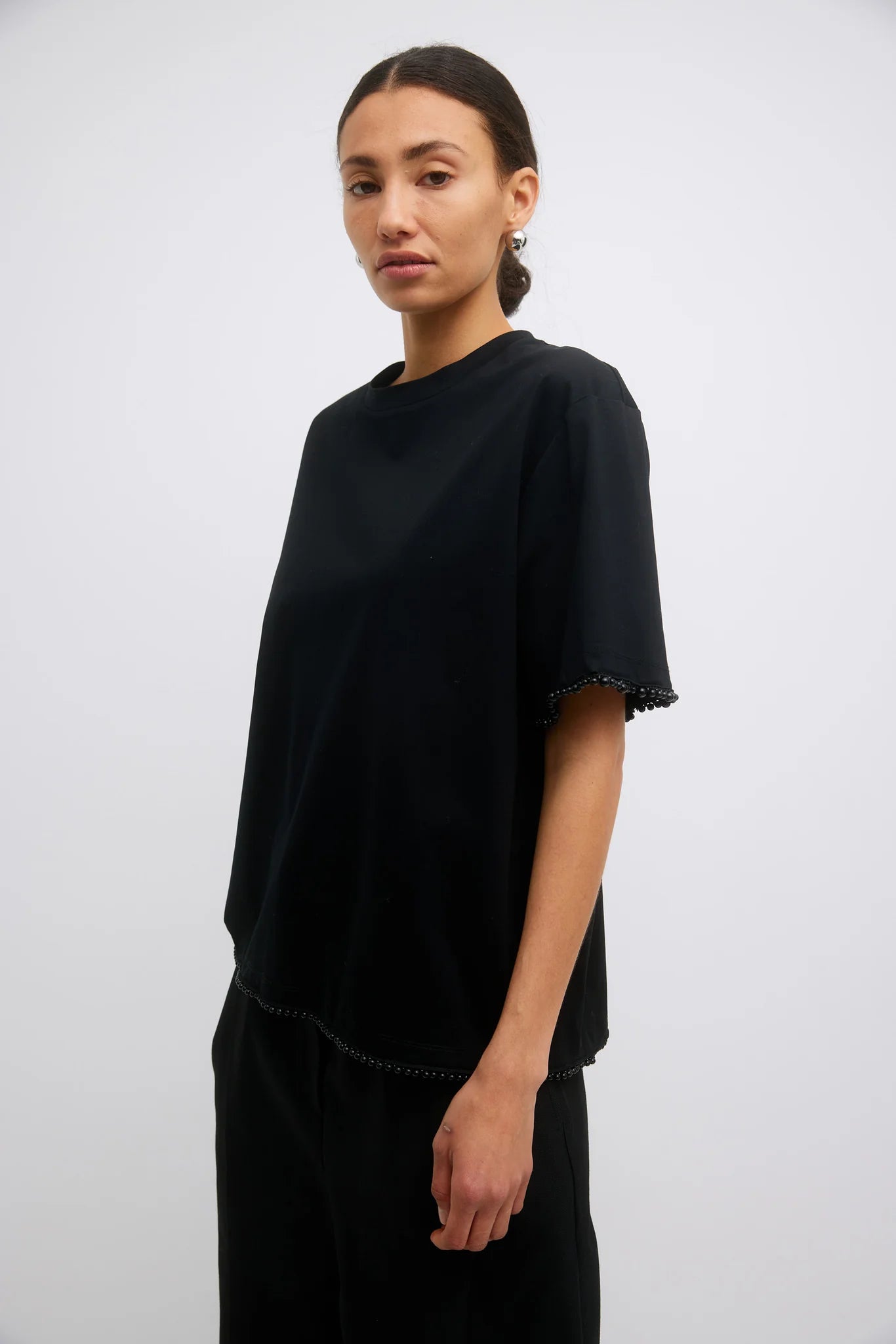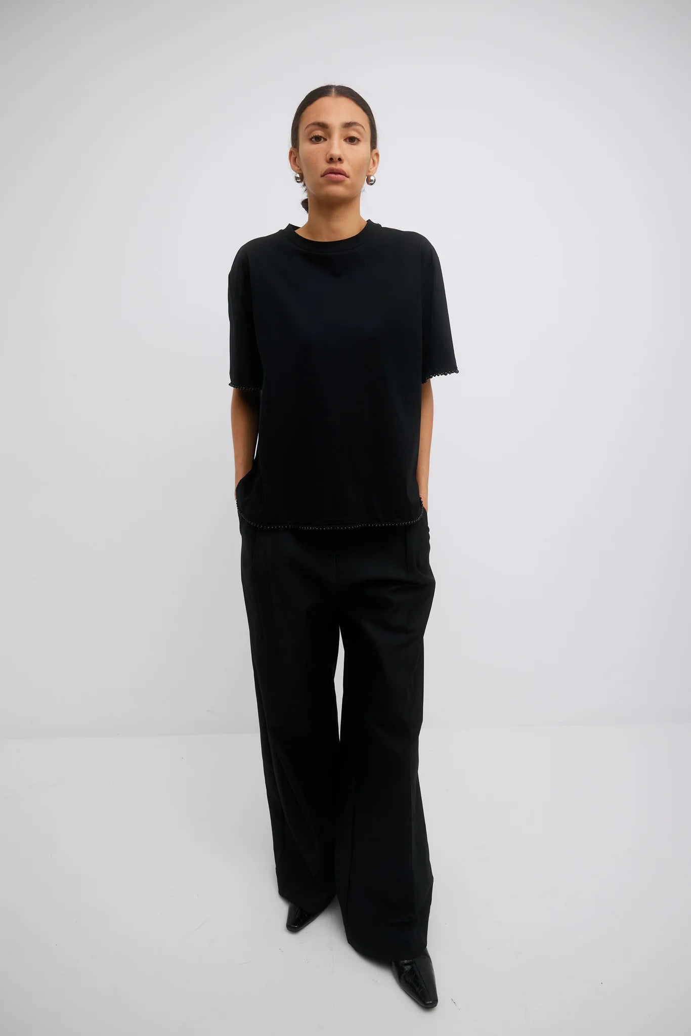 Elevate your wardrobe with the Gregory Mira Tee. Made with a premium Japanese cotton blend, this versatile piece can be dressed up or down, providing comfort and style. With a chic design, crew neck, short sleeves, and hip length, it's the perfect addition to any outfit. Plus, the beaded trim adds an extra touch of sophistication.