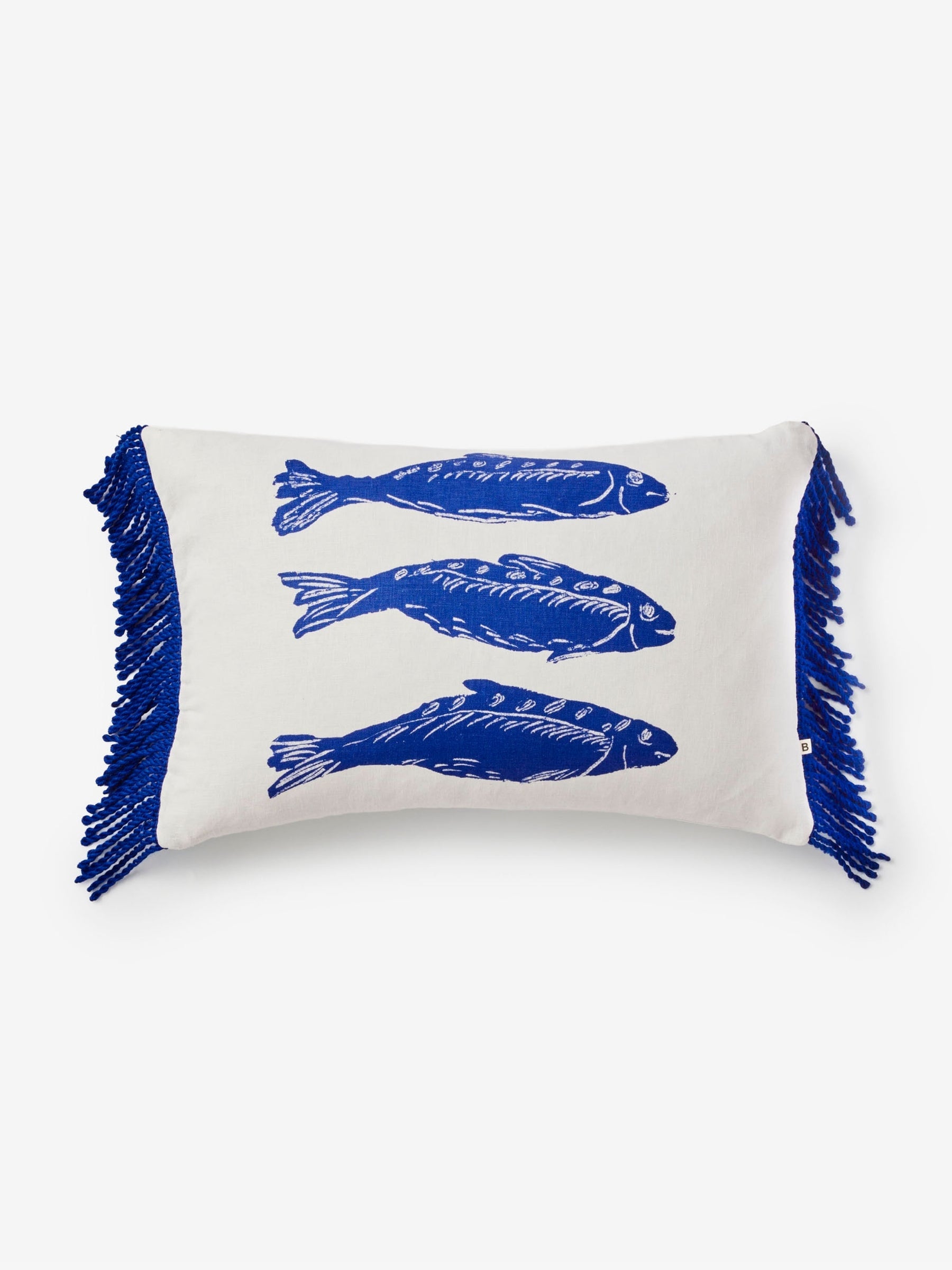 A playful linen cushion featuring hand-drawn blue sardines on an oat base, finished with soft fringing. Light-hearted and unmistakably Mediterranean, this fish motif adds a coastal feel to any space.