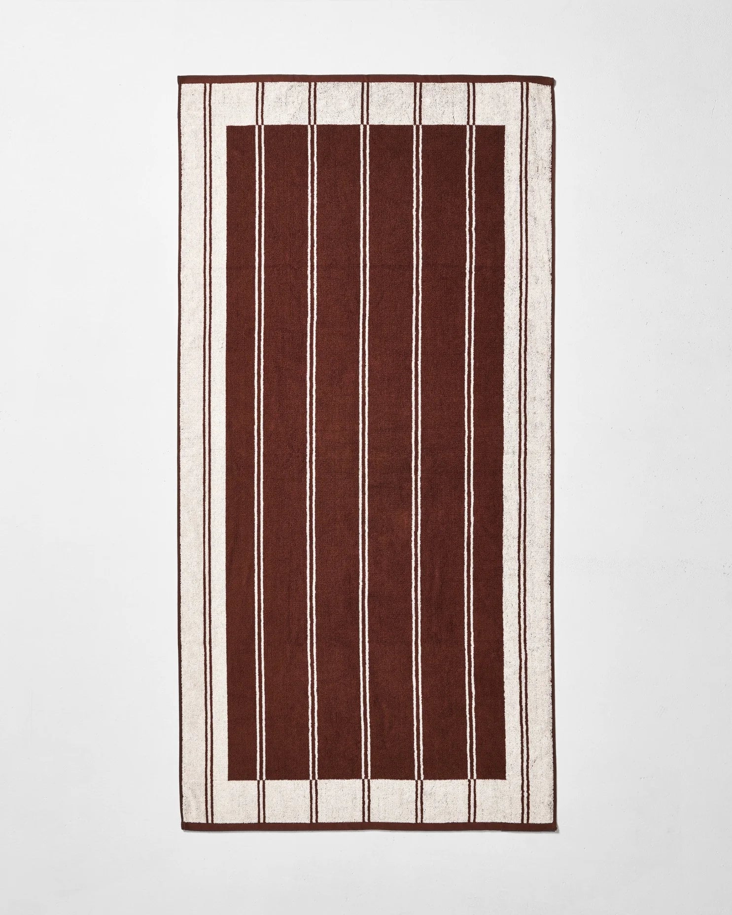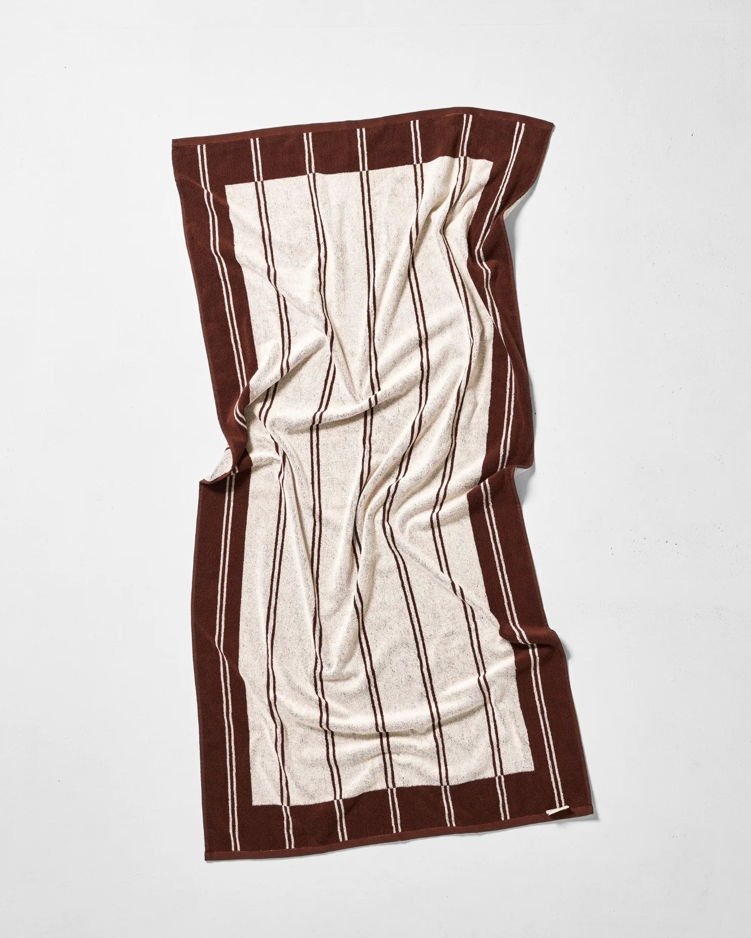 The classic Twin Stripe design and deep Chocolate Brown hue give a timeless, premium aesthetic. The 550gsm weight cotton strikes the perfect balance between luxe and lightweight, making it easy to pack and ready to tag along for every memory-making moment, whether you're drying off after a swim or lounging in the sun on holiday.